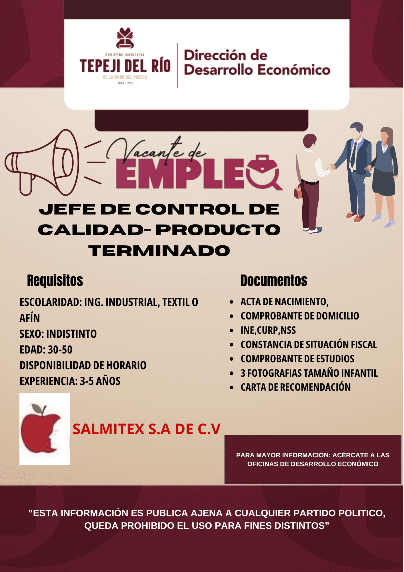 DESARROLLO ECONOMICO BOLSA DE TRABAJO NOVIEMBRE 2025 Formulario de Contacto Formulario de contactoΔ Newsletter NombreApellidosCorreoEstado Civil- Estado Civil -Soltera (o)Unión LibreCasada (o)Numero de telefonoEscolaridad- Escolaridad -PrimariaSecundariaBachilleratoBachillerato TécnicoLicenciaturaVacantesSeleccione una opciónAIRES DEL CAMPO AYUDANTE GENERALALRETECH GUARDIA DE SEGURIDADAMANALI ELECTRICOASTRA COORDINADORA DE CUENTAS POR COBRARASTRA JEFE DE MANTENIMIENTOASTRA MECANICOAUTOTANQUES NIETO AYUDANTE GENERALAUTOTANQUES NIETO LIMPIEZA DE OFICINASAUTOTANQUES NIETO MONITORISTA DE UNIDADESAUTOTANQUES NIETO SUPERVISOR DE CENTRO DE MONITOREOAUTOTANQUES NIETO TECNICO MECANICO DIESELMATERIALES OTLAXPAN AUXILIAR CONTABLEBANCO AZTECA ASESOR DE CREDITOS Y SERVICIOS FINANCIEROSBANCO AZTECA GESTOR DE COBRANZABIENES RAICES LUNA ASESOR INMOBILIARIOCAUDILLOS BARMANCAUDILLOS COCINER@CONCORD ALMACENISTAEMPEÑO FACIL CAJERO VENDEDORFARMACIAS DEL AHORRO CAJER@FRIALSA SURTIDORGAS TOMZA DE MEXICO PLANTERO DE CARGAGEEP OPERADOR DE ENTREGAGERSA AYUDANTE DE ALMACENGRUPO JADI AYUDANTE DE ALMACENGRUPO JADI AYUDANTE DE BARTENDERGRUPO JADI AYUDANTE DE COCINAGRUPO JADI BARTENDERGRUPO JADI CAPITAN DE MESEROGRUPO JADI CHEFGRUPO JADI COCINEROGRUPO JADI HOSTESSGRUPO JADI LAVALOZASGRUPO JADI MESEROGRUPO SANCHEZ OPERADOR DE PRODUCCIÓNHOSPITAL SAN RAFAEL MEDICO GENERALHOSPITAL SAN RAFAEL GINECOLOGO(A)HOSPITAL SAN RAFAEL PEDIATRAHOSPITAL SAN RAFAEL AUXILIAR DE FARMACIAJARRITOS HOJALATERO PINTORKALTEX APPAREL CONFECCIÓNKALTEX AUXILIAR GENERALKFC AYUDANTE GENERALLITTLE CAESAER AYUDANTE GENERALLIVERPOOL AUXILIAR ADMINISTRATIVOLIVERPOOL AYUDANTE GENERALLIVERPOOL CAJER@LIVERPOOL COCINER@LIVERPOOL ENFERMER@LIVERPOOL ESPECIALISTA SOPORTE FUNCIONALLIVERPOOL MECANICOLIVERPOOL OFICIOS VARIOSLIVERPOOL INTELIGENCIA OPERATIVALIVERPOOL SUPERVISOR DE OPERACIONES LOGISTICASMASARI AYUDANTE DE MECANICOMASARI AYUDANTE MULTIFUNCIONALMATERIALES SAN JUDAS TADEO VENDEDOR DE MOSTRADORMIRO OPERADOR DE TRACTOCAMIÓNMODELOS YASIRO OPERARIO DE COSTURAMODELOS YASIRO OPERARIO DE TINTORERIAMODELOS YASIRO OPERARIO GENERALNEW REST AUXILIAR DE COMEDORPRESTA PRENDA PROMOTOR VALUADORPILGRIM´S AYUDANTE GENERALPILGRIM´S AUXILIAR DE PLANTA DE HARINASPILGRIM´S SANIDADSALMITEX AUXILIAR DE CALIDADSALMITEX ANALISTA DE LABORATORIO QUIMICOSALMITEX AUXILIAR DE CALIDADSALMITEX AYUDANTE GENERAL HABILITADOSALMITEX AYUDANTE GENERAL DE ESTAMPADOSALMITEX JEFE DE ALMACEN HABILITACIÓN TEXTILSALMITEX JEFE DE CONTROL DE CALIDAD DE PTSANITY ALMACENISTA MATERIA PRIMA Y EMPAQUESANITY ALMACENISTA PRODUCTO TERMINADOSANITY AYUDANTE GENERALSANITY JEFE DE PLANTASEGURIDAD PRIVADA COBRA CUSTODIO EN UNIDADESSENSACIÓN AUXILIAR DE TIENDASUPER MOVIL ASESOR DE VENTASSUPER MOVIL PASAJE BOULEVARD ASESOR DE VENTAS EN TELEGONÍAT&A SOLUCIONES SUSTENTABLES AYUDANTE GENERALT&A SOLUCIONES SUSTENTABLES OPERADOR DE TRACTOCAMIÓNTRADE POLYMERS ASISTENTE DE CALIDADTRUPER AYUDANTE GENERALTRUPER OPERADOR CNCUTTT ESPECIALISTA TÉCNICO AREA SISTEMASUTTT SUPERVISOR DE CAMPO CLINICOVITRO OPERADOR DE ENTREGAWIMO PAY VENDEDOR COMISIONISTAZAGIS AYUDANTE GENERALZAGIS AYUDANTE DE REPARTOAdicionalEnviar × Atención En caso de no estar en el catálogo la vacante visualizada en redes sociales, manifieste su interés en la sección Información adicional.